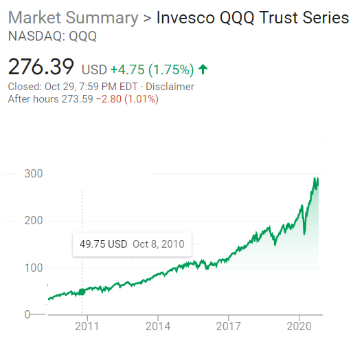 That’s better then 20% APY (yearly). Click graph to the right to enlarge and see this 10 year growth period. I writing this on Oct 29, 2020 I am looking at the last ten years from the day I wrote this.